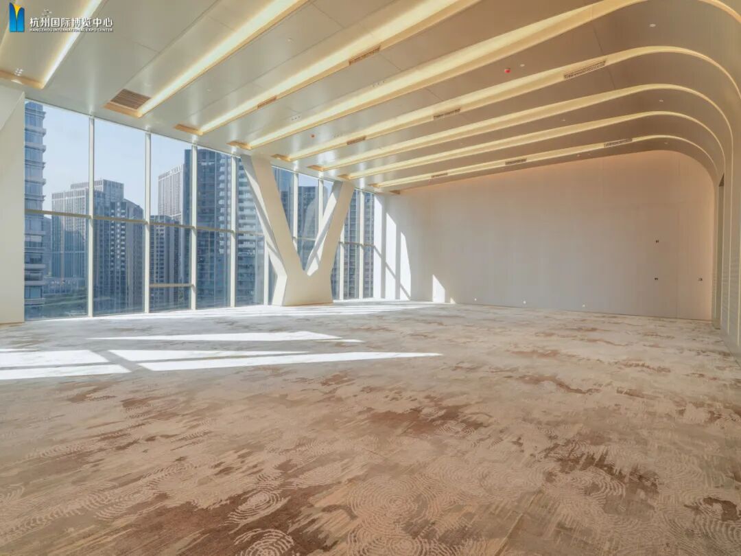 杭博二期配备46个会议室,会议总面积超过10000平方米,其中最大会议室面积为6000平方米,无论是大型国际会议还是小型商务研讨,充足的会议室资源以及宽敞明亮的多功能厅,为参会嘉宾营造更加舒适优渥的洽谈环境。商务接待区的整体风格以中国江南传统园林为原型,步入其中可感受场馆独特空间魅力。配套酒店杭州奥体万丽酒店共29层,景观客房408 间,多功能会议厅11个,空中泳池1个,让商务参会更具优质体验感。 杭博二期通过双层空中连廊与地下通道,与杭博一期实现物理空间与运营功能上的无缝衔接,共同构成一个展览面积为15万平方米,建筑总面积将达 130万平方米的都市会展综合体。目前,整体工程已进入竣工收尾的冲刺阶段,即将正式投入运营。接下来,杭博将继续以“产业开放平台”和“生活开放平台”为品牌愿景,依托一流的设施设备和创新的服务理念,持续为长三角地区的产业协同和资源整合注入全新活力,并携手各方合作伙伴,共同为区域经济协作贡献更多力量。